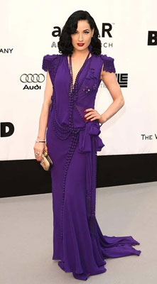 It is Jean Paul Gaultier who designed the Dita Von Teese dress, colored by a purple that suits also very well to Natalie Portman and Estelle Lefébure, who has chosen a bustier dress by Ralph Lauren.